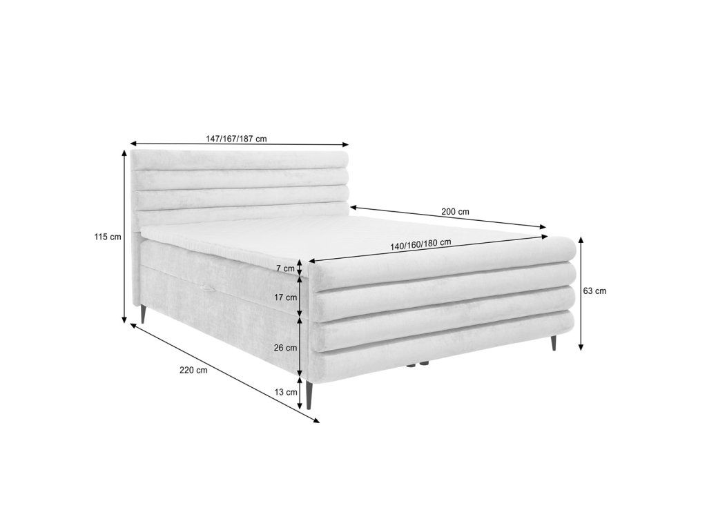 Postel je konstruována jako boxspring (kontinentální) systém, tedy vícevrstvá základna zajišťující optimální rozložení hmotnosti, správnou oporu páteře a komfortní vstávání díky vyšší ložné ploše.