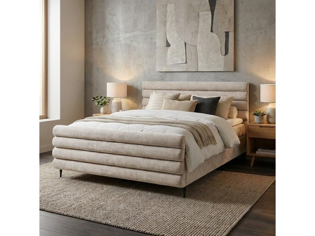 Čalouněná konstrukce s designově vrstveným čelem a předním čelem dodává posteli elegantní a útulný vzhled.