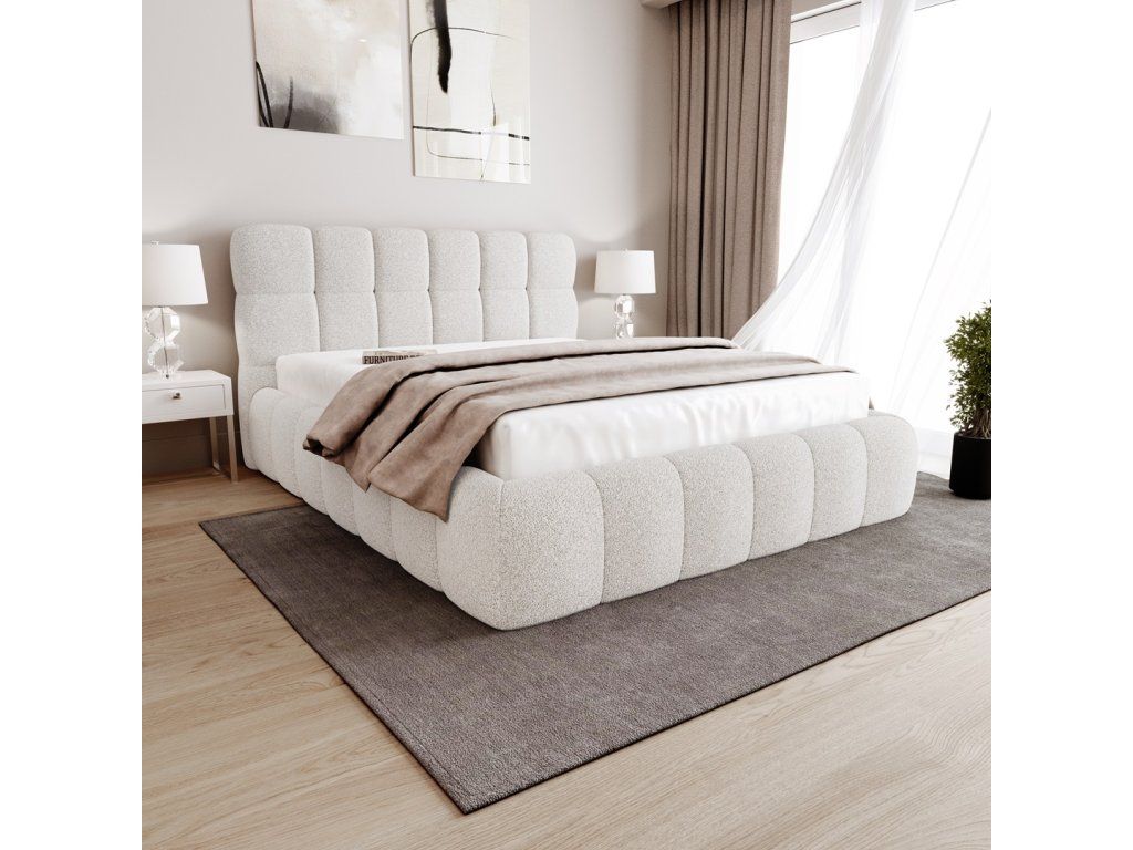 Celý rám postele je potažen moderní bouclé látkou, která je velmi příjemná na dotek a patří mezi aktuální trendy v interiérovém designu. Díky zaobleným liniím a bohatému čalounění působí postel velmi pohodlně a vytváří pocit maximálního komfortu.