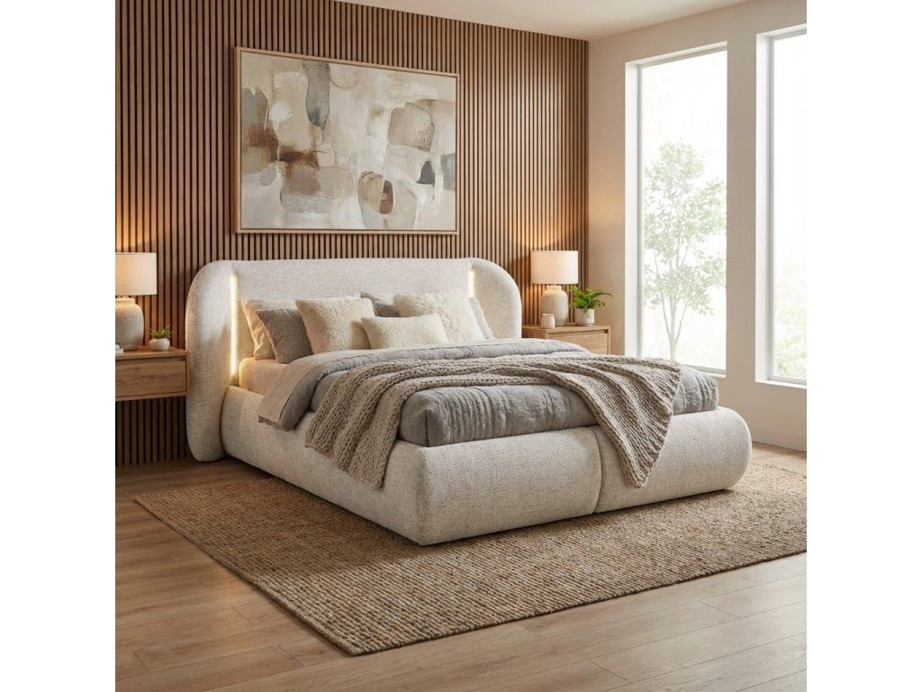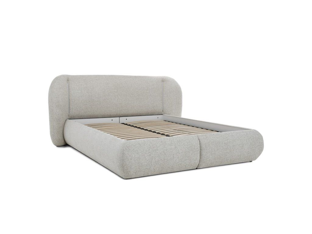 Design postele je charakteristický měkce zaoblenými liniemi a vysokým čalouněným čelem, které působí elegantně a útulně zároveň. Čelo je nejen estetickým prvkem, ale i pohodlnou oporou při večerním odpočinku.