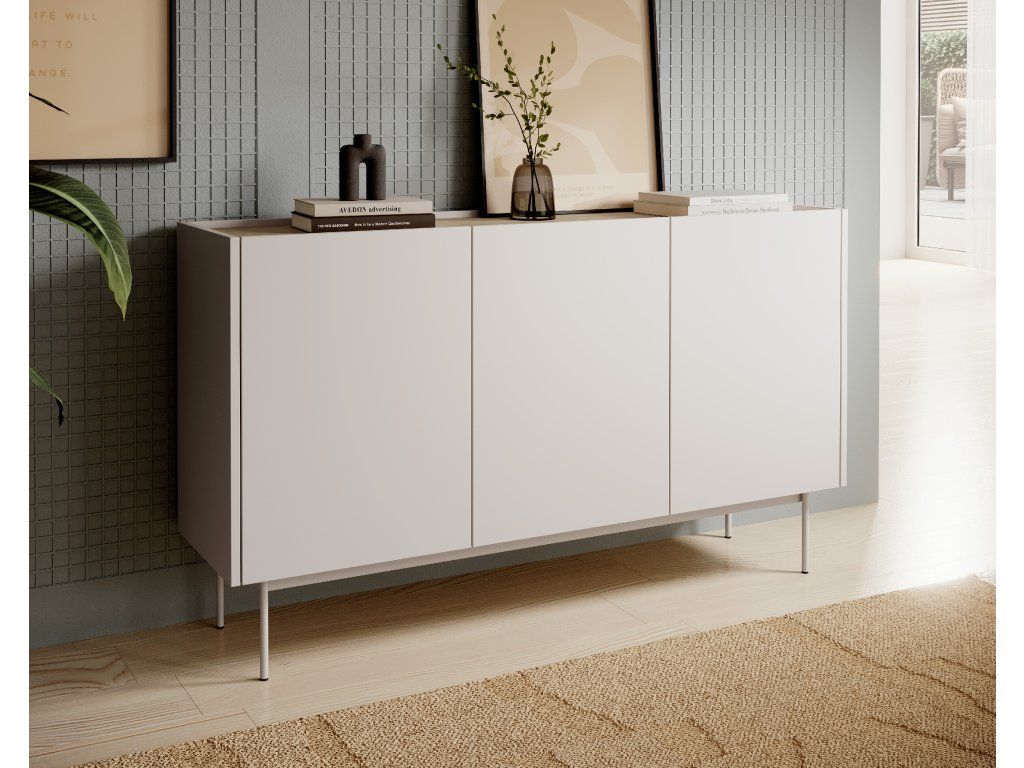 Komoda nabízí praktický úložný prostor ukrytý za třemi dvířky, uvnitř rozdělený do šesti policových přihrádek, které poskytují dostatek místa pro uložení nádobí, dokumentů, textilu nebo dalších domácích doplňků. Díky bezúchytkovému provedení působí nábytek velmi čistě a elegantně, zatímco kovové nohy v barvě dekoru dodávají komodě lehkost a usnadňují úklid pod nábytkem.