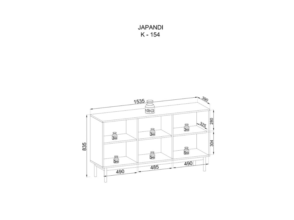 Komoda nabízí velkorysý úložný prostor rozdělený do šesti uzavřených přihrádek, které poskytují dostatek místa pro uložení nádobí, dokumentů, textilu nebo dalších domácích doplňků. Díky vyvýšené konstrukci působí nábytek vzdušně a zároveň usnadňuje úklid pod komodou.