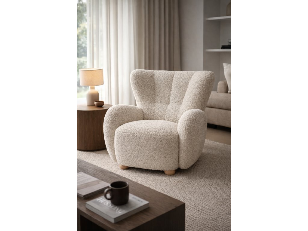 Designové křeslo Ciro zaujme svými oblými tvary, měkkým provedením a mimořádným komfortem. Díky příjemné bouclé látce a ergonomickému tvarování vytváří ideální místo pro relaxaci, čtení i odpočinek v moderním interiéru.