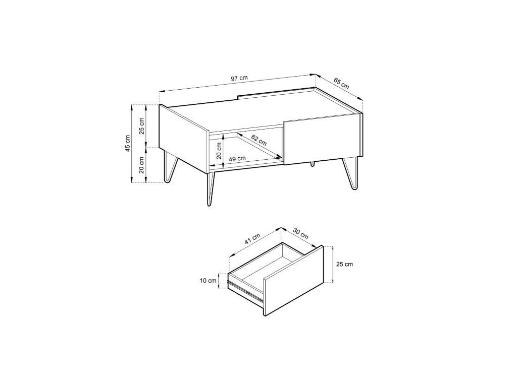 Stolek nabízí praktické řešení úložného prostoru v podobě zásuvky a otevřené police, které umožňují přehledné uložení ovladačů, časopisů nebo dalších drobností. Horní deska poskytuje dostatek místa pro odložení nápojů, dekorací nebo každodenních potřeb.