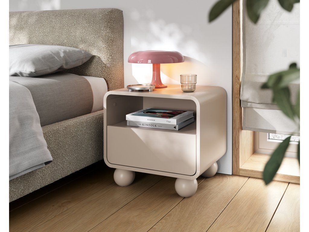 Moderní noční stolek Albion v elegantním kašmírovém provedení zaujme svým jemným designem se zaoblenými hranami, které dodávají nábytku lehkost a nadčasový vzhled. Díky svým kompaktním rozměrům je ideální volbou vedle postele v ložnici, ale skvěle poslouží také jako menší odkládací stolek v obývacím pokoji.