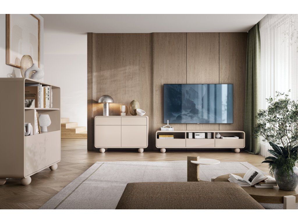 Neutrální kašmírová barva se snadno kombinuje s dalšími doplňky a nábytkem, takže sestava zapadne do různých stylů interiéru. Zaoblené tvary a kulaté nožky dodávají nábytku jemný a nadčasový charakter.